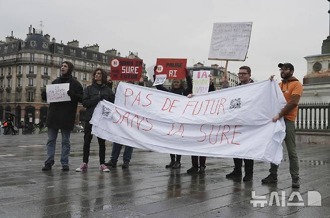 [파리=AP/뉴시스] 10일(현지 시간) 프랑스 파리의 바스티유 광장에서 시위대가 "안전한 인공지능(AI) 없이 미래도 없다"라고 쓰인 펼침막을 들고 시위하고 있다. 이날 파리에서 AI의 효과적인 사용과 규제 방안을 모색하는 제3차 AI 행동 정상회의가 개막했다. 2025.02.11.