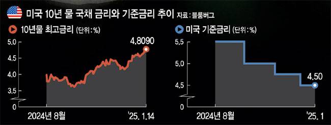 ◇기준금리 인하에 역주행하는 국채 금리 = 일반적으로 기준금리와 국채 금리는 상관관계를 가지고 있다. 기준금리가 인하하면 자금 조달 비용이 줄어 채권과 같은 투자 자산이 몰리기 때문이다. 수요가 높아지면 채권 가격은 높아지고 채권 금리는 하락하게 된다. 하지만 최근에는 기준금리와 국채 금리가 동조가 아닌 역행하고 있다. 채권 시장의 기준이 되는 미국 10년 만기 국채 금리의 경우 지난달 14일 4.8090%까지 치솟았다. 이는 지난 2023년 11월 이후 1년 2개월여 만에 최고치였다. 미국 중앙은행인 연방준비제도(Fed)가 지난해 9월 4년 반 만에 금리 인하(0.50%포인트)에 나서며 ‘피벗’(pivot·통화정책 전환)을 시작했지만 국채 금리는 반대로 상승 추세를 이어가고 있는 것이다. 실제 미국이 지난해 기준금리를 총 1%포인트 낮추는 동안, 미국 국채 10년물 금리는 1%포인트 이상 오른 것으로 나타났다.