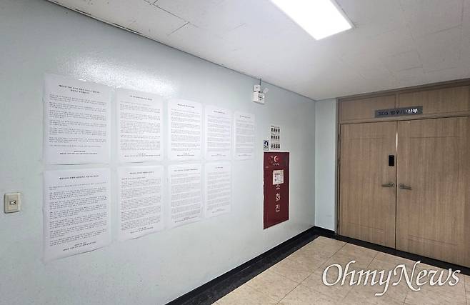 | ▲ 매일신문 3층 편집국 앞 복도에 48기부터 60기 까지의 기자들이 지난 10일 성명서를 대자보로 붙여놓았다. |