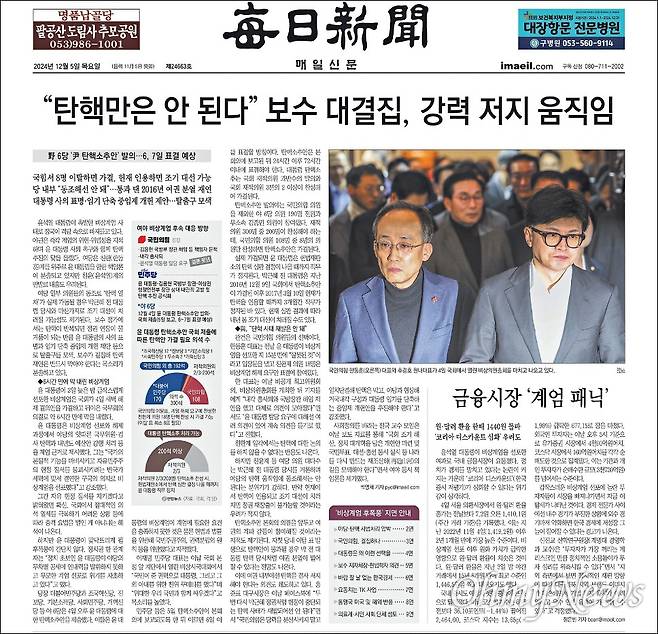 | ▲ 지난해 12월 5일자 매일신문 1면에 <'탄핵은 안 된다' 보수 대결집, 강력 저지 움직임> 기사를 배치했다. 매일신문 기자들은 이 기사를 예로 들어 편파적인 보도라고 비판하고 있다. |