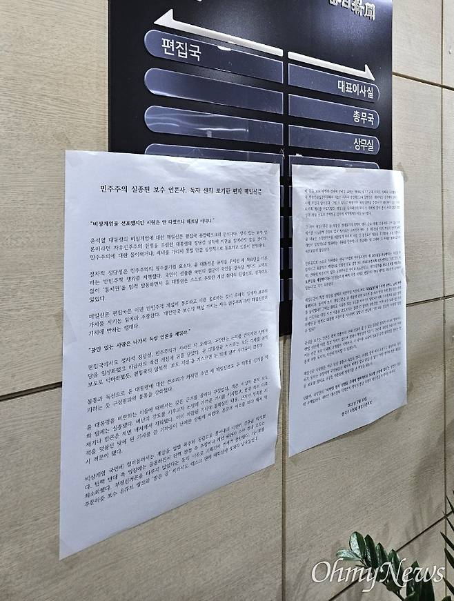 지난 10일 <매일신문> 3층 편집국 앞에는 2011년 입사한 48기부터 지난해 입사한 60기까지의 기자들이 낸 성명서가, 대표이사실로 향하는 복도에는 한국기자협회 매일신문지회가 낸 대자보가 붙었다.