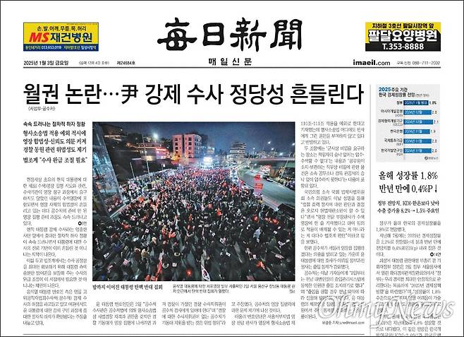 | ▲ 매일신문 1월 3일자 1면. 사법부와 공수처의 월권 논란에 윤 대통령의 강제 수사 정당성이 흔들린다는 보수 입장을 대변하는 기사를 배치해 자사 기자들로부터 비판의 목소리가 나온다. |
