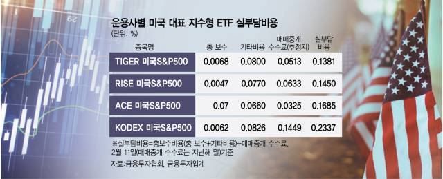 11일 서울경제신문이 각 운용사 미국 대표 지수형 ETF 투자 설명서와 금융투자협회 자료를 분석한 결과 미국 대표 지수인 스탠더드앤드푸어스(S&P)500을 추종하는 삼성자산운용의 ‘KODEX 미국S&P500’의 실부담 비용은 0.2337%로 집계됐다. 이는 동일 지수를 추종하는 미래에셋자산운용의 ‘TIGER 미국S&P500’의 실부담 비용 0.1381% 대비 0.0956%포인트 높은 수치다. 삼성운용의 총보수(0.0062%)는 미래에셋운용(0.0068%)보다 더 낮았지만 실제 비용 부담은 삼성운용이 오히려 더 큰 것이다.