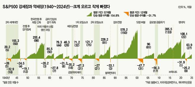 그러나 미국 강세장이 끝났다고 판단하기에 이른 시점일 수 있다. 쿼터백자산운용은 1940년부터 2024년까지 85년간의 미국 증시 강세장과 약세장을 분석했다. 미국 S&P500지수를 따져보니, 강세장은 평균 57개월 동안 이어졌고 154% 올랐다. 반면 약세장은 평균 12개월간 31% 하락에 그쳤다. 가장 긴 강세장은 1987년 블랙먼데이 이후 시작했다. 1988년부터 150개월, 12년 이상 이어졌고 주가는 578% 뛰었다.