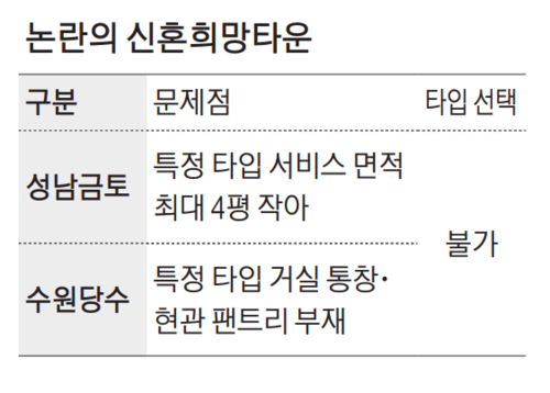 한국토지주택공사(LH)가 공급하는 공공분양주택인 '신혼희망타운'(신희타)에서 전용 면적이 같은데도 일부 타입만 서비스 면적이 작거나 공간 활용성이 낮아 해당 타입 당첨자들 불만이 폭주하고 있다.