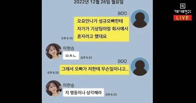 특히 마지막 세장의 사진처럼 모 유튜브 채널에서 언급된 것과 같은, '오빠 걔 거짓말하는 애야'라는 표현을 들은 적도, '안나야 너 거짓말하고 다니는 애라며, 김가영이 그러던데?'라고 옮긴 적도 일절 없습니다. 고인과 그런 비슷한 대화 자체를 나눈 적이 없습니다.