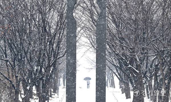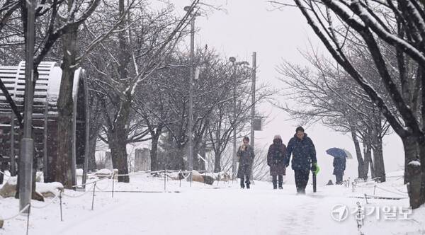 12일 인천 남동구 중앙공원에서 시민들이 눈을 맞으며 발걸음을 옮기고 있다.