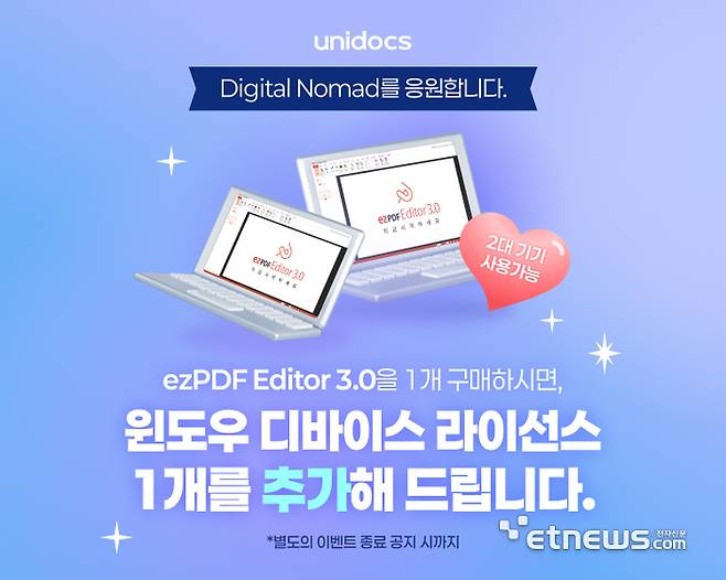 이번 프로모션을 통해 'ezPDF Editor 3.0'의 연간 라이선스를 구매하는 고객은 별도의 추가 비용 없이 하나의 라이선스로 두 개 디바이스에서 소프트웨어를 사용할 수 있다. 예를 들어, 하나의 연간 라이선스(1년)를 구매하면 집과 회사에서 각각 PC를 사용하거나, 회사의 개인 데스크톱과 개인 노트북을 병행하여 사용할 수 있다.