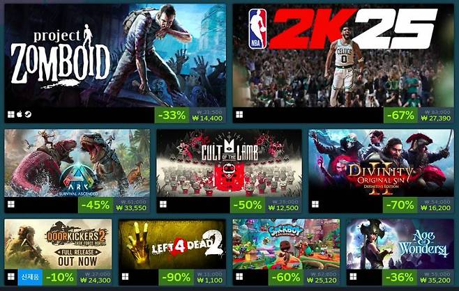 가장 눈에 띄는 건 인기 타이틀 할인 코너다. 해당 코너에서는 ‘체인드 투게더(10%)’, ‘발더스 게이트 3(20%)’, ‘프로젝트 좀보이드(33%)’, ‘길티기어 스트라이브(50%)’, ‘레인월드(55%)’, ‘콜 오브 듀티 블랙 옵스 3(67%)’, ‘2 K25(67%)’, ‘레프트 포 데드 2(90%)’ 등을 할인가로 만나볼 수 있다.