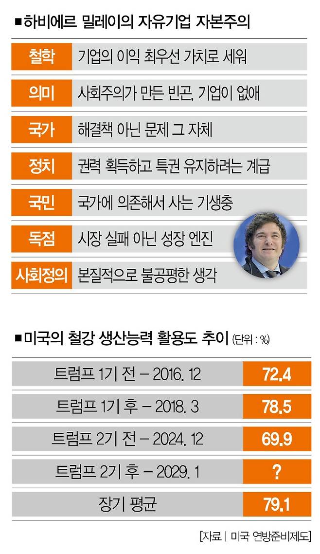 # 하지만 완전히 다른 듯한 트럼프의 정책은 의외로 선명한 지점을 가리키고 있다. 바로 밀레이 아르헨티나 대통령이 주장한 '자유기업 자본주의(Free enterprise capitalism)'의 세계관이다. 더스쿠프가 트럼프가 꿈꾸는 세상을 들여다봤다. 그 첫번째 편이다.
