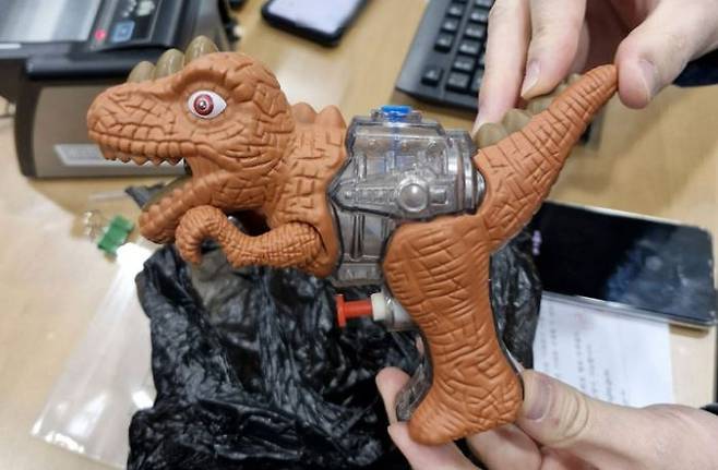이 남성은 지난 10일 검은 비닐봉지를 씌운 공룡 모양의 장난감 물총을 권총인 것처럼 위장해 은행에 들어와 돈을 탈취하려 했습니다.