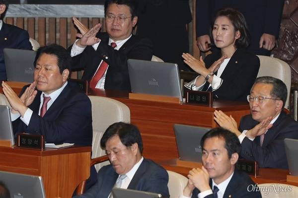 2019년 10월 22일 문재인 대통령이 국회에서 시정연설을 하는 동안 검찰개혁법안의 조속한 처리를 당부하자 나경원 원내대표를 비롯한 자유한국당(국민의힘 전신) 의원들이 손으로 X자 모양을 그렸습니다.