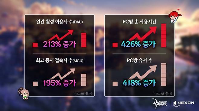 12일 게임업계에 따르면 던전앤파이터는 올해 1월 시행한 ‘중천’ 업데이트 이후 일간 활성 이용자 수(DAU)가 전월 대비 213% 증가한 것으로 나타났다. 최고 동시 접속자 수(MCU)도 195% 상승했다. PC방에서 던전앤파이터를 접속한 총 사용 시간은 지난 1월 전월 대비 426% 늘어난 9만 7889시간을 기록했다. PC방 유저 수는 418% 급증한 4만 1660명을 기록했다.