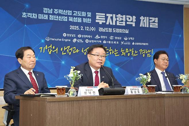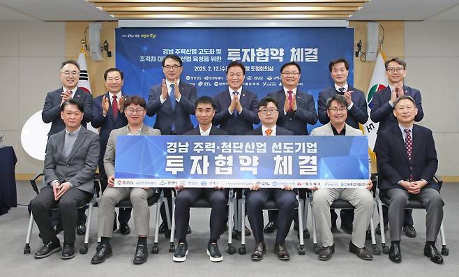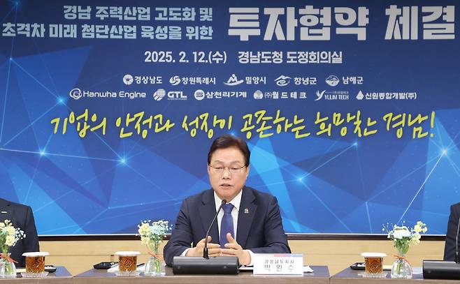 박완수 도지사는 12일 경남도청 도정회의실에서 홍남표 창원시장, 안병구 밀양시장, 성낙인 창녕군수, 장충남 남해군수, 강민욱 한화엔진㈜ 전무이사, 황건호 ㈜지티엘 대표이사, 서재원 ㈜삼천리기계 대표이사, 서기훈 ㈜월드테크 대표이사, 조현호 ㈜유림테크 대표이사, 김성민 신원종합개발㈜ 대표이사와 투자협약을 체결했다.