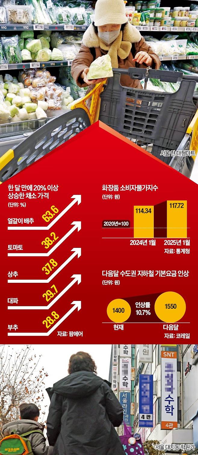생활물가 인상은 전방위로 번지고 있다. 지난해 서울 아파트 월평균 관리비는 ㎡당 3242원으로 전년 대비 5% 상승했고, 수도권 지하철 요금은 다음달 1400원에서 1550원으로 10.7% 인상된다. 수도요금 추가 인상 우려도 커지고 있다. 서울시가 2022년 t당 평균 73원 올린 데 이어 상반기 추가 인상 가능성을 내비쳤기 때문이다. 작년 말 서울 지역 성인 여성커트 1회 비용은 2만2769원(행정안전부 발표)으로 1년 새 7.2% 상승했다. 같은 기간 남성커트 가격도 3.1% 올라 1만2538원이 됐다.