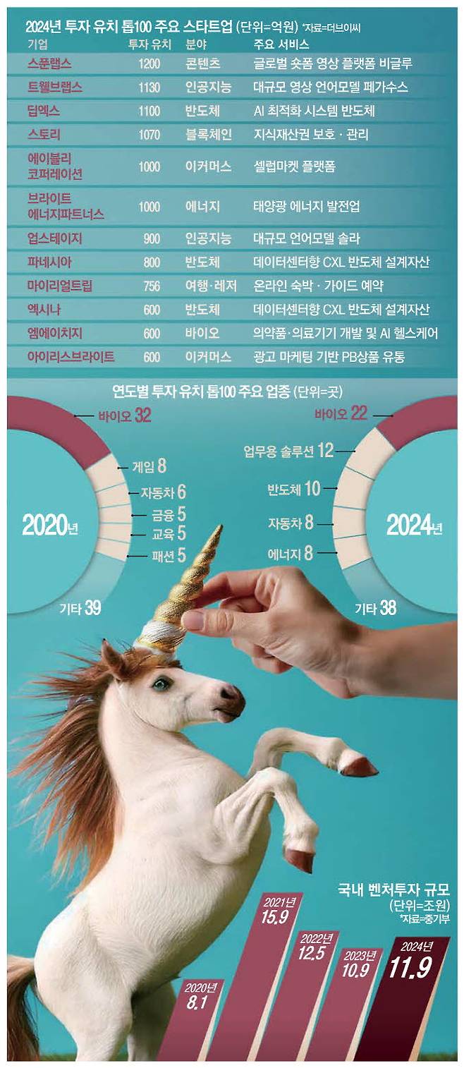 다만 더브이씨 자료에 따르면 투자 상위 100대 스타트업의 투자 유치 규모는 2021년 10조3450억원에 달했지만 2022년 7조8058억원, 2023년 4조3766억원, 지난해 3조4266억원으로 계속 줄어든 것으로 나타났다.