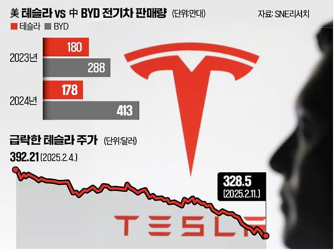미국 전기자동차 업체 테슬라 주가가 1주일 새 16% 넘게 급락했다. 일론 머스크 테슬라 최고경영자(CEO)가 챗GPT 개발사 오픈AI 인수 시도, 미국 정부 혁신 작업 등에 집중하는 동안 후발 주자인 중국 비야디(BYD)가 자율주행 경쟁에서 급격히 치고 올라오면서다.