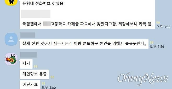 오픈카톡방 '윤석열 탄핵 반대 모여라'에서 지지자들은 번호 공유를 한 뒤에 "국힘갤(디시인사이드 국민의힘 갤러리)에서 ○○고등학교 카페글 파묘해서 찾았다고 함. 저장해보니 카톡 뜸"이라고 밝혔다.