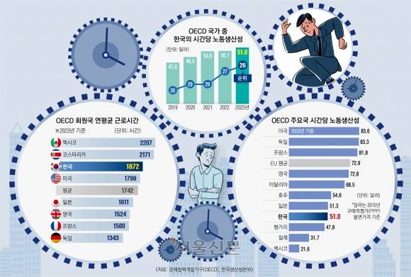 경제협력개발기구(OECD)와 한국생산성본부에 따르면 2023년 한국의 시간당 노동생산성은 51.0달러로, OECD 37개국 중 26위에 그쳤다. 미국은 83.6달러로 한국의 1.6배에 이르렀고 독일(83.3달러), 프랑스(81.8달러), 영국(72.8달러), 일본(51.3달러)도 한국을 앞섰다. 유럽연합(EU) 회원국 평균인 72.9달러와도 20달러 넘게 차이 났다. 우리보다 노동생산성이 떨어지는 나라는 헝가리, 칠레, 멕시코 등이다.