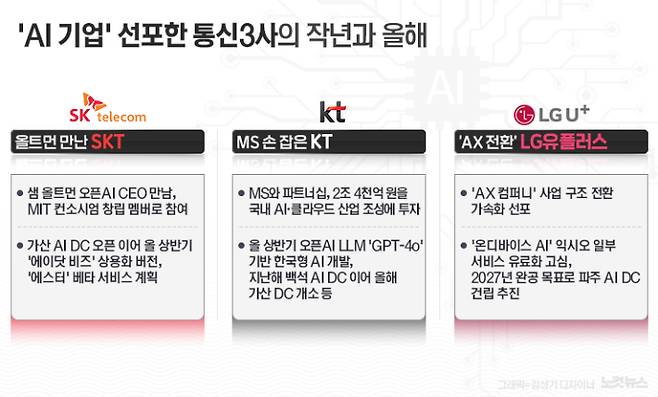 'AI 기업'으로의 전환을 공식화한 SK텔레콤과 KT, LG유플러스 등 국내 통신3사가 미국의 빅테크 기업들과 접촉하거나 AI 인프라를 구축하는 등의 후속 작업을 분주히 이어가고 있다.
