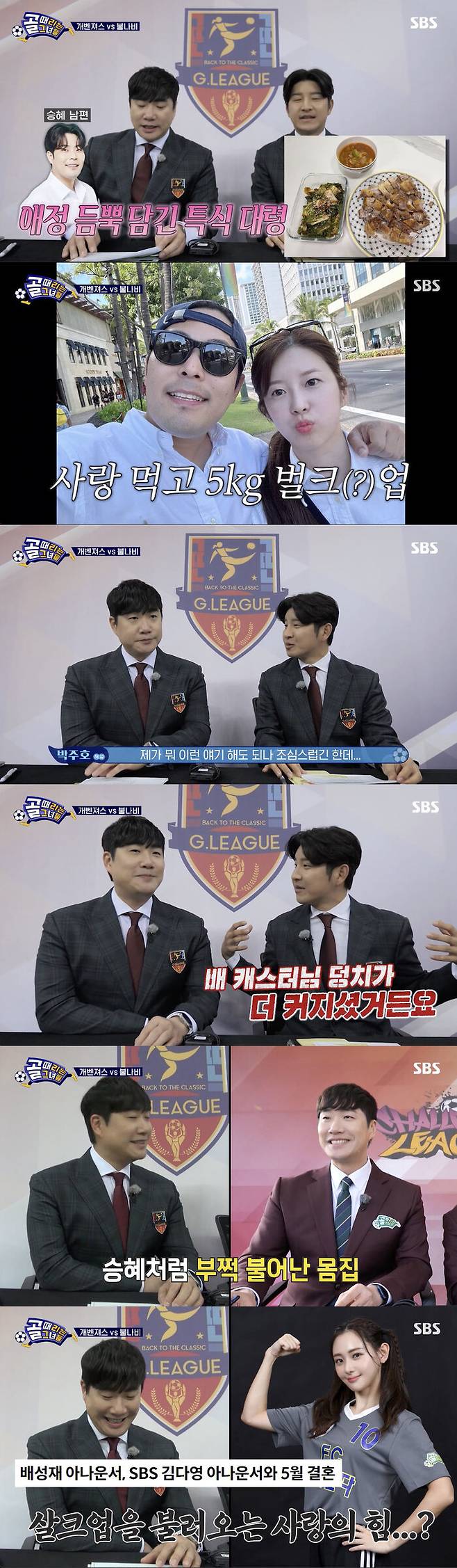 이어 "매번 특식 대령을 해서 무려 5kg 벌크업을 했다고 한다"라고 밝혀 모두를 놀라게 했다. 이에 박주호는 "제가 뭐 이런 얘기해도 되나 조심스럽긴 한데 캐스터님도 덩치가 너무 커지셨다"라고 지적했다.