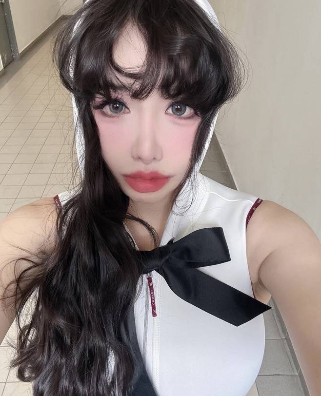 사진에서 박봄은 검정색 리본으로 포인트를 준 흰색 수영복을 입고 포즈를 취하고 있다.