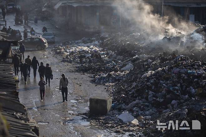 [가자시티=AP/뉴시스] 12일(현지 시간) 가자지구 가자시티에서 팔레스타인 주민들이 불에 타는 쓰레기 더미 옆을 지나고 있다. 가자지구 내 쓰레기 수거가 이뤄지지 않아 주민들이 거리에 쓰레기를 버리고 있다. 2025.02.13.