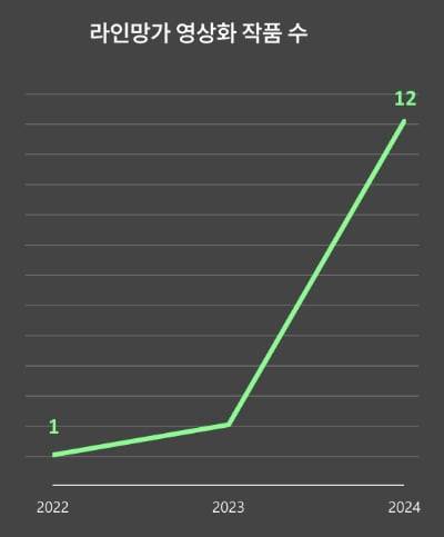 라인망가가 웹툰을 영상화하는 데 본격 뛰어든 것은 지난해부터다. 지난해 총 12개 웹툰을 드라마, 애니메이션으로 제작했다. 2022년 1개, 2023년 2개였던 것을 대대적으로 늘렸다. 올해 7월에는 라인망가에서 연재한 일본 웹툰 ‘크레바테스’를 애니메이션으로 선보인다. ‘다크문’ ‘레드아이스’ ‘전지적 독자시점’ 등 공개를 앞둔 애니메이션도 여럿이다.