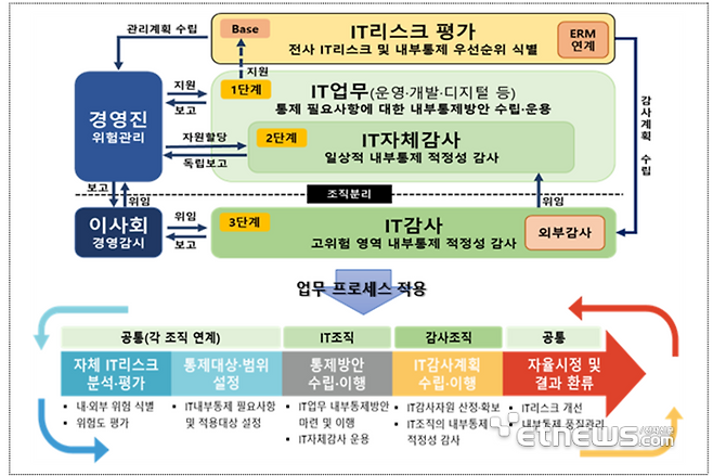 가이드라인은 금융사의 IT내부통제체계를 3단계로 구분했다. 먼저 △IT조직이 IT내부통제 방안을 수립 및 이행하고 △IT조직 내 자체감사인을 통해 내부통제의 적정성을 점검한 뒤 △감사조직의 IT감사인을 통해 IT부문 전반의 적정성을 감사하도록 했다. IT감사업무 수행단계에 따라 준수해야 할 주요 절차 등 업무 기준도 담겼다.