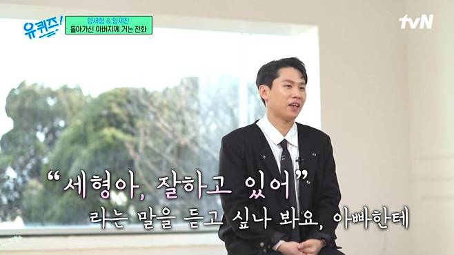 양세형은 "아버지가 돌아가시고 나서 번호를 못 지우겠더라. 최후로 결정해야 할 때 항상 아버지께 여쭤봤다. 아버지가 말씀해 주시면 항상 그 얘기가 맞았다. 서른이 되고, 마흔이 넘어도 어른인 척 결정하려고 할 때 힘들다. '잘하고 있어'라는 말을 아버지께 듣고 싶나보다"라며 그리움을 표했다.