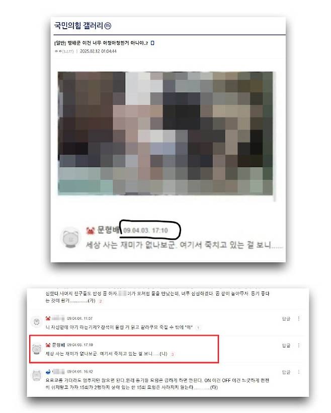 | ▲ 인터넷 커뮤니티 ‘디시인사이드’의 국민의힘 갤러리에 지난 12일 01시쯤 올라온 게시물 ‘행배쿤 이건 너무 아청아청한거 아니야..?’라는 제목의 게시물(위)에는 출처를 알 수 없는 음란물 사진 아래 문형배 헌법재판관으로 추정되는 인물이 직접 댓글을 단 것처럼 글을 올렸지만, 실제 해당 카페 글은 음란물 게시글이 아닌 '끝말 잇기' 게시판에 올라온 글(아래)이었다. |