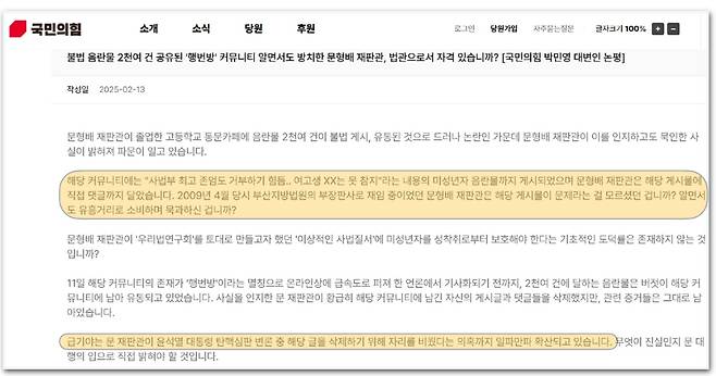 박민영 국민의힘 대변인도 13일 논평에서 "해당 커뮤니티에는 '사법부 최고 존엄도 거부하기 힘듬.. 여고생 XX는 못 참지'라는 내용의 미성년자 음란물까지 게시되었으며 문형배 재판관은 해당 게시물에 직접 댓글까지 달았다"고 주장했다가, 이후 해당 대목을 삭제했다.
