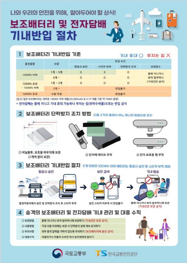 국토부는 우선 보조배터리와 전자담배는 수하물 위탁을 금지하는 한편 기내 반입은 허용하되 용량과 수량을 제한하고 보관 규정도 엄격하게 적용한다. 이에 따라 승객들은 용량 100Wh 이하 보조배터리는 최대 5개까지 소지한 채 비행기에 탈 수 있다. 5개가 넘으면 항공사 승인이 필요하다. 항공사는 의료목적 등 특별한 사유가 있으면 이를 허용한다. 100Wh~160Wh 보조배터리는 항공사 승인을 받을 경우 2개까지 소지할 수 있다. 아울러 승인된 배터리에는 검색 때 신속한 확인이 될 수 있게 별도 표식(스티커)이 부착된다. 반면 용량이 160Wh를 넘으면 기내 반입이 불가능하다.