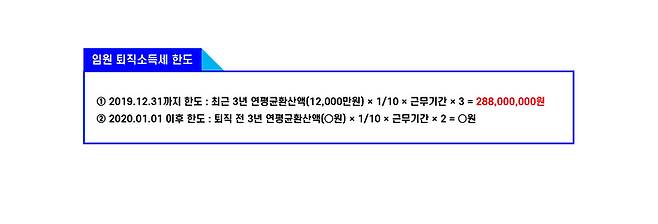2019년 12월 31일까지 동일하게 월 1,000만 원씩을 지급하였기 때문에 3년 연평균 환산액은 12,000만 원이 되어 ①번의 임원 퇴직소득세 한도는 3배수를 적용하면 288,000,000원이 되고, ②번의 임원 퇴직소득세 한도는 퇴직 전 3년 동안 급여를 동일하게 월 1,000만 원씩 지급하였기 때문에 3년 연평균 환산액은 12,000만 원이 되어 2배수를 적용하면 144,000,000원이 됩니다. 때문에 이 임원의 경우 ①+②=432,000,000원은 퇴직소득세, 초과 금액 68,000,000원은 근로소득세로 과세되는 것입니다.