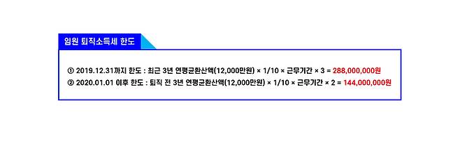 2019년 12월 31일까지는 무보수로 근무한 기간이기 때문에 ①번의 임원 퇴직소득세 한도는 0원이고, 퇴직 전 3년 동안 급여를 동일하게 월 1,000만 원씩 지급하였기 때문에 3년 연평균 환산액은 12,000만 원이 되어 ②번의 임원 퇴직소득세 한도는 144,000,000원이 됩니다. 때문에 이 임원의 경우 144,000,000원은 퇴직소득세, 초과 금액 356,000,000원은 근로소득세로 과세되는 것입니다.