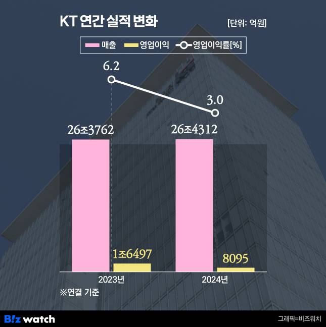 KT는 지난해 연결재무제표 기준 매출이 전년 대비 0.2% 증가한 26조4312억원으로 잠정 집계됐다고 13일 공시했다. 영업이익은 50.9% 줄어든 8095억원, 순이익은 54.5% 감소한 4501억원이다. 일회성 인건비가 반영된 탓이다. 다만 이를 제외한 영업이익은 전년 대비 9.8% 확대한 1조8118억원이다.