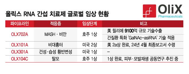 현재 올릭스는 OLX702A를 포함한 올릭스 글로벌 임상 단계 파이프라인 4종에 모두에 cp-asiRNA 플랫폼 기술을 적용 중이다. 가장 개발 단계가 앞선 비대흉터 치료제 'OLX101A'와 미국 1상을 진행 중인 건성·습성 황반변성 치료제 'OLX301A', 호주 1상 완료 후 피부·모발재생 분야 공동연구를 추진 중인 'OLX104C' 등이 있다.