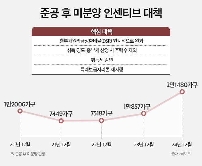 정치권 일부에서는 지방 준공 후 미분양 주택에 대해 총부채원리금상환비율(DSR)을 한시적으로 완화해야 한다는 의견도 거론된다. 소득 대비 대출 원금·이자를 얼마나 부담할 수 있는지를 따져 대출 한도를 제한하는 제도인 DSR이 완화되면, 주택 구입 자금 조달이 쉬워질 수 있다는 판단에서다.