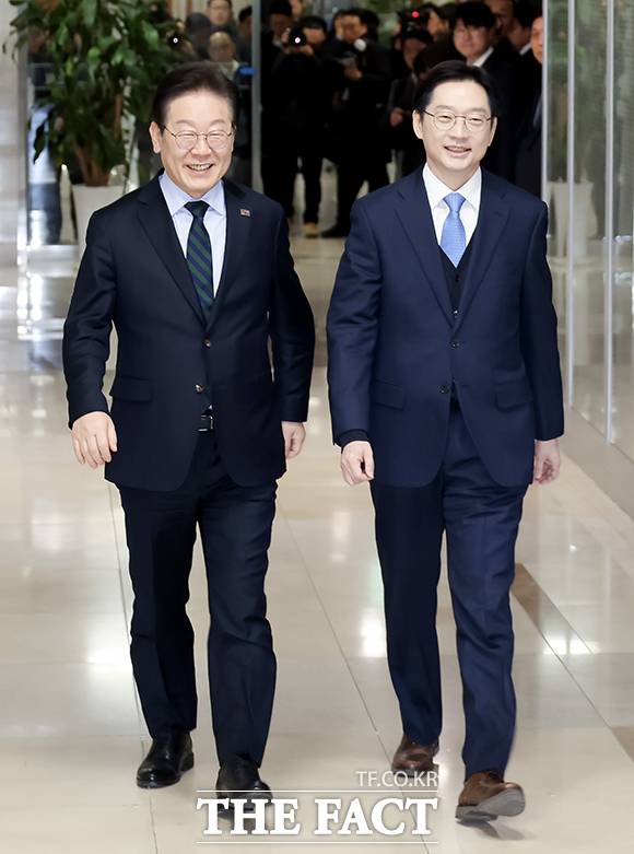 [더팩트ㅣ국회=박헌우 기자] 이재명 더불어민주당 대표(왼쪽)와 김경수 전 경남도지사가 13일 오후 서울 여의도 국회에서 회동을 위해 이동하고 있다.