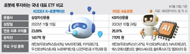 지난해 인공지능(AI)에 이어 올해 로봇 관련 종목들이 부상하면서 관련 산업에 투자할 수 있는 상장지수펀드(ETF)에도 관심이 쏠리고 있다. 국내 상장된 대표적인 로봇 투자 ETF 가운데 테마에 집중 투자하려면 ‘RISE AI&로봇’, 리스크를 안정적으로 관리하려면 ‘KODEX K-로봇액티브’에 관심을 둘 필요가 있다.