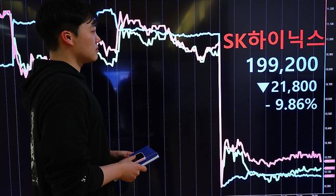 | ▲ 딥시크 쇼크에 반도체주 급락 중국 인공지능(AI) 스타트업 딥시크 충격으로 국내 반도체주가 급락한 1월 31일 오후 서울 종로구 연합인포맥스에 설치된 화면에 이날 하락한 SK하이닉스 주가(분홍색 선)와 반도체 투자 상장지수펀드 주가 (UNICORN SK하이닉스밸류체인액티브-초록색 선, ACE 엔비디아밸류체인액티브-파란색 선)그래프가 표시되어 있다. |