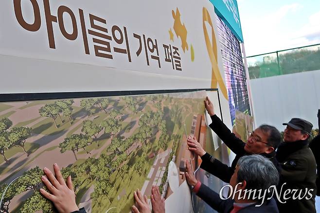 | ▲ 4.16생명안전공원 착공식이 13일 오후 4시 16분 경기 안산시 안산산업역사박물관 주차장에서 진행됐다. 참석자들이 공원 조감도 퍼즐을 맞추고 있다. |