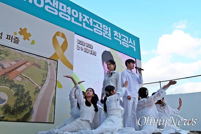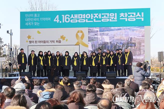 13일 오후 '4시 16분' 경기도 안산시 화랑유원지에서 진행된 착공식은 유족들의 합창으로 시작됐다. 노란 스카프를 두른 4.16 합창단은 "너희를 가슴에 묻은 우리 모두가 엄마·아빠다", "날마다 고마웠고 매 순간 사랑했다"는 노랫말을 수차례 불렀다.