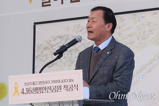| ▲ 4.16생명안전공원 착공식이 13일 오후 4시 16분 경기 안산시 안산산업역사박물관 주차장에서 진행됐다. 박태순 안산시의회 의장이 축사를 하고 있다. |