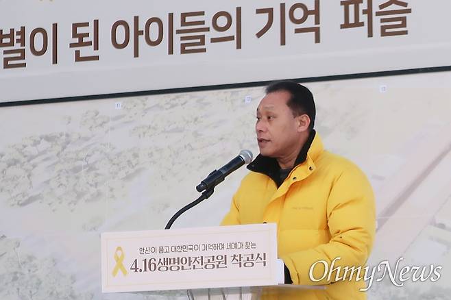 | ▲ 4.16생명안전공원 착공식이 13일 오후 4시 16분 경기 안산시 안산산업역사박물관 주차장에서 진행됐다. 김종기 4.16세월호참사가족협의회 운영위원장이 인사말을 하고 있다. |