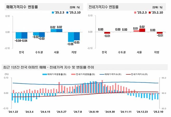전국 아파트 매매가는 전주와 같은 하락폭(-0.04%)을 유지했다. 수도권(-0.02%→-0.03%)은 하락폭 확대, 지방(-0.06%→-0.05%)은 하락폭이 축소됐다. 전국 주간 아파트 전세가격(-0.01%)은 지난주(0.00%) 대비 하락 전환됐다. 수도권(0.00%→0.00%)은 보합 유지, 서울(0.01%→0.02%)은 상승폭이 확대됐고 지방(0.00%→-0.01%)은 하락 전환됐다. 한국부동산원 관계자는 "재건축 추진단지 등 선호단지에서는 매도자 우위시장 보이며 상승세가 유지되고 있지만 그 외 단지에서는 매수 관망세 지속되며 지역·단지별 상승·하락이 혼재되어 나타나는 등 서울 전체 상승이 지속되고 있다"고 설명했다.