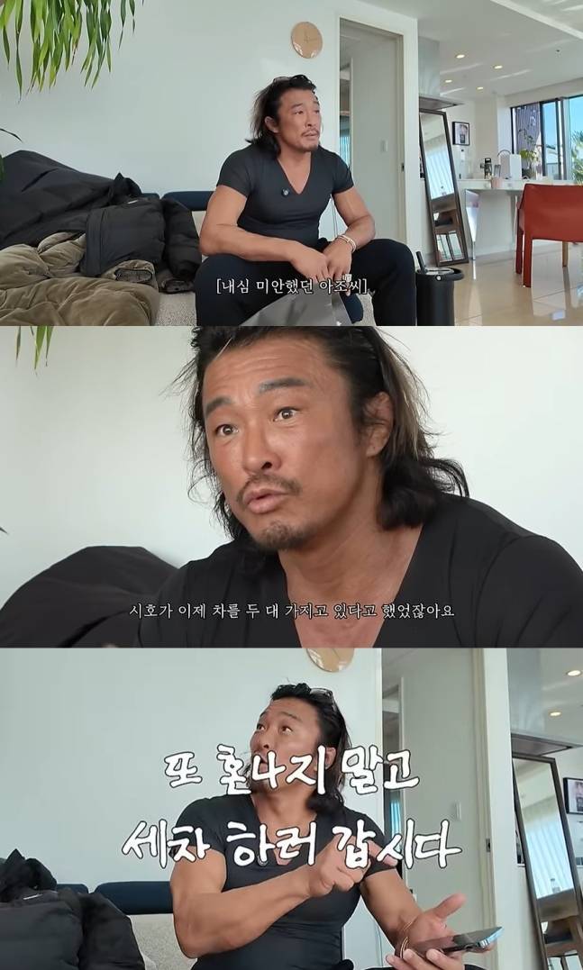 추성훈은 "말하기도 싫다. 차 새로 샀다고 한다. 이 차 갖다주고, 새 차가 온다. 그게 다음 주에 온다고 한다. 그니까 세차 괜히 했다"며 분노했다.