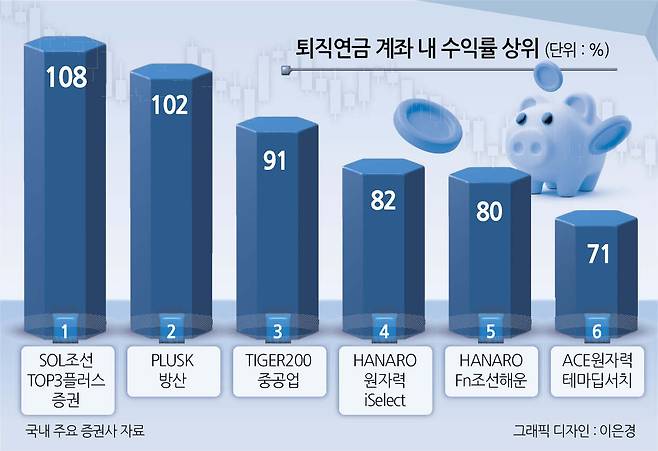 ▶퇴직연금에서 빛난 ‘국내 주식형 ETF’ 톱3=퇴직연금 자산 운용에서 국내 주식형 ETF가 외면받고 있지만 방산·조선·원자력 등 일부 산업 부문은 100%에 달하는 수익률을 자랑한다.