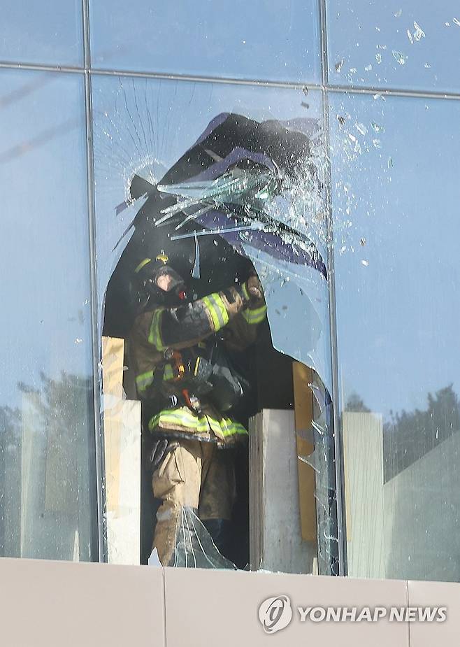 (부산=연합뉴스) 강선배 기자 = 14일 부산 기장군 반얀트리 호텔 신축 공사장 화재 현장에서 소방대원들이 연기를 빼내기 위해 유리창을 깨고 있다. 2025.2.14
