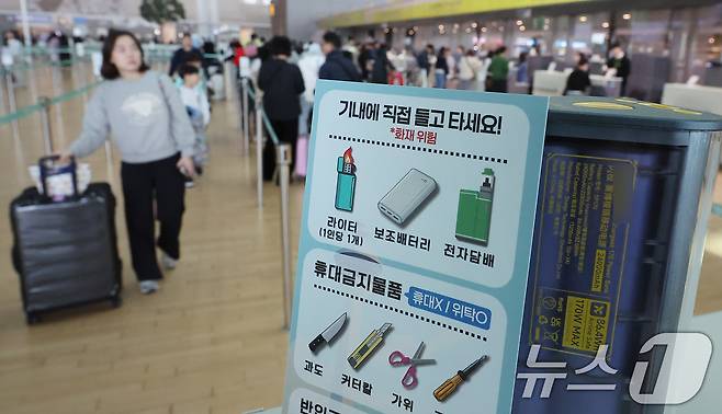사진은 14일 오후 인천국제공항 제2터미널 출국장에 비치된 보조배터리 기내 반입 안내문. 2025.2.14/뉴스1